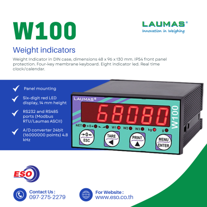 W100 หน้าจอแสดงผลเครื่องชั่งหรือสัญญาณโหลดเซลล์ / LAUMAS Weight Indicator, A/D converter 24bit , RS232/RS485(Modbus RTU) , 6 digit display,14mm height