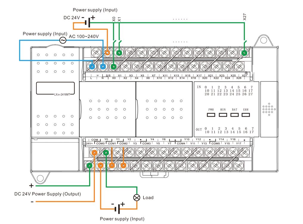 AC Supply โดยรหัสอักษรคือ A รองรับแรงดันใช้งานประเภทไฟฟ้ากระแสสลับ AC 85..264V ซึ่งหากเป็น PLC รุ่นที่แรงดันทำงานเป็น AC ตัว CPU จะมี DC Power supply มาให้ในตัวซึ่งจะมีขั้วต่อแรงดัน DC สำหรับใช้งานที่ขั้ว 24+ และ COM ซึ่งจะใช้สำหรับต่อใช้งาน Signal control หรือ Instrument เท่านั้นเพราะจะมีกำลังวัตต์และกระแสไม่สูงมากนัก