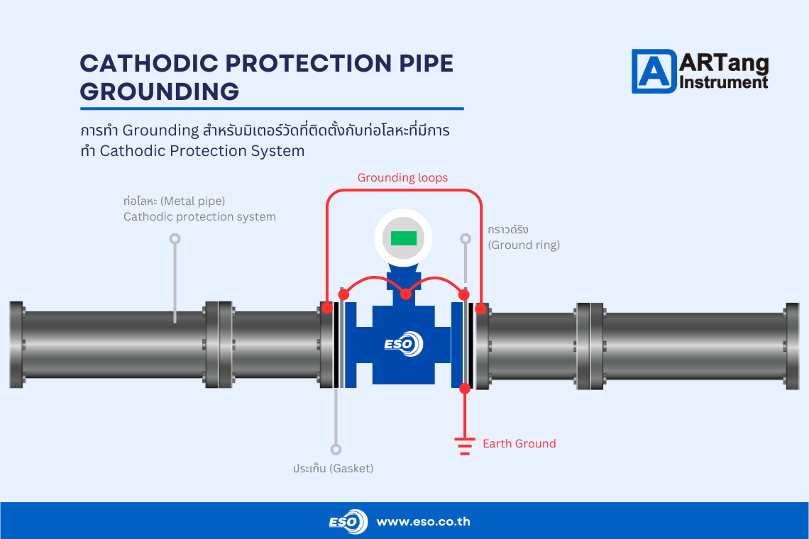ภาพแสดงการต่อ Ground สำหรับงานติดตั้ง Electromagnetic flow meter กับท่อโลหะที่มีการทำ Cathodic Protection