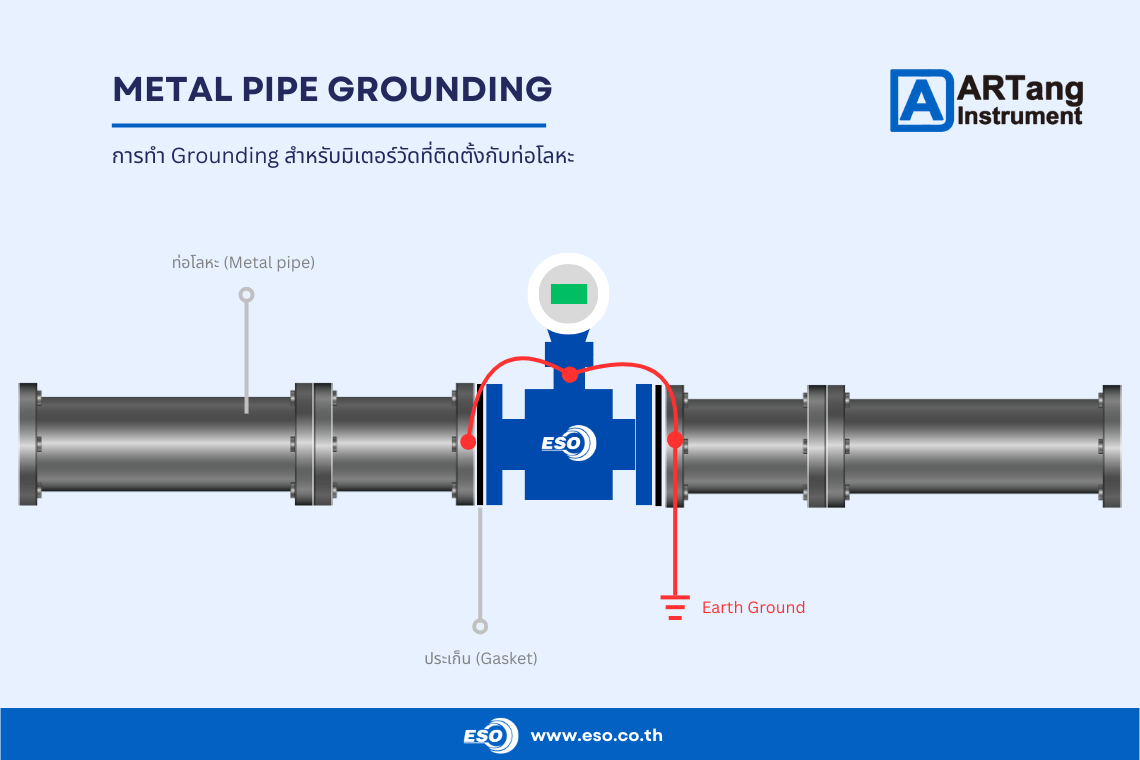 1. Grounding for conductive pipe การทำกราวด์ดิ้งกับท่อที่เป็นโลหะ สำหรับท่อท่อที่เป็นโลหะมีคุณสมบัตินำไฟฟ้าได้นั้นเราไม่จำเป็นต้องใช้ Ground ring เนื่องจากท่อที่เป็นโลหะจะเชื่อมต่อกับตัว Electromagnetic Flow Meter ผ่านโบลท์และปะเก็นซึ่งตัวโครงสร้างของ Electromagnetic Flow Meter เองส่วนใหญ่ก็จะเป็นเหล็กหล่อ หรือสแตนเลสสตีลอยู่แล้ว ในกรณีนี้เราจะทำการต่อกราวด์กับตัว Electromagnetic Flow Meter เข้ากับท่อโลหะทั้งสองฝั่งทั้งด้าน Upstream , Downstream จากนั้นต่อลงกราวด์ระบบก็เพียงพอและถูกต้องตามคู่มือการติดตั้ง โดยหน้าแปลนหรือท่อโลหะทั้งสองฝั่งก็เปรียบเสมือนกราวด์ริงนั่นเอง