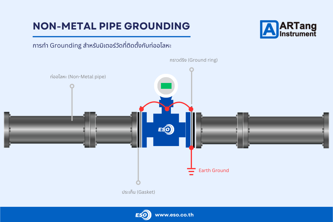 2. Grounding for Non-conductive pipe การทำกราวด์ดิ้งกับท่อที่เป็นอโลหะ โดยมากที่พบเจอบ่อยจะเป็นท่อ PVC หรือ PTFE ซึ่งกรณีนี้จำเป็นจะต้องใช้อุปกรณ์เสริมกราวด์ริง (Ground ring) โดยเราจะติดตั้งกราวด์ริงทั้งสองฝั่งของ Electromagnetic Flow Meter และติดตั้งปะเก็นเข้ากับหน้าแปลนของท่ออโลหะทั้งสองฝั่งตามปกติ โดยเราจะต่อกราวด์ที่ตัว Electromagnetic Flow Meter จากนั้นต่อไปที่กราวด์ริงทั้งสองฝั่งและต่อลงกราวด์ระบบตามลำดับไป เพื่อให้การวัดค่ามีความสเถียรและแม่นยำ ซึ่งการต่อกราวด์ก็ใช้สำหรับเป็นจุดอ้างอิงให้กับสัญญาณของวงจร differential amplifier ก่อนที่จะส่งสัญญาณไปยังคอนเวอร์เตอร์เพื่อแปลงผล