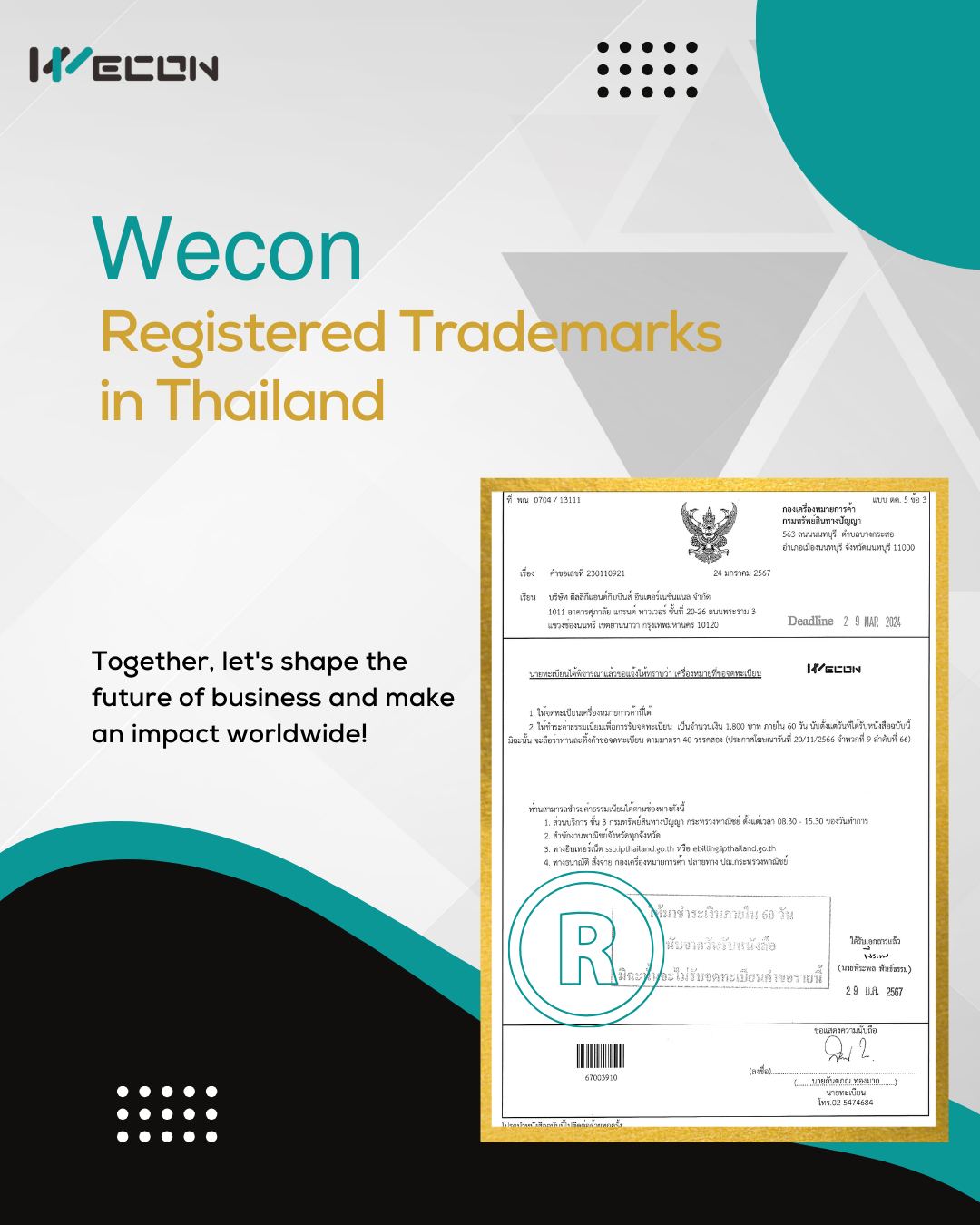 เมื่อเดือนมกราคมที่ผ่านมานับว่าเป็นหมุดหมายที่สำคัญอีกก้าวของ WECON ที่ได้จดทะเบียนเครื่องหมายการค้าในประเทศไทย ซึ่งนับเป็นก้าวย่างความสำเร็จที่สำคัญทางธุรกิจสำหรับ WECON ในประเทศไทยที่เติบโตมาจนปัจจุบันนับตั้งแต่เริ่มทำตลาดในประเทศไทย โดย WECON จะถือสิทธิ์ต่างๆ ในโลโก้แบรนด์ , สินค้า และผลิตภัณฑ์ สิทธิ์ในการแต่งตั้งตัวแทนจำหน่ายและการตลาดสำหรับประเทศไทย