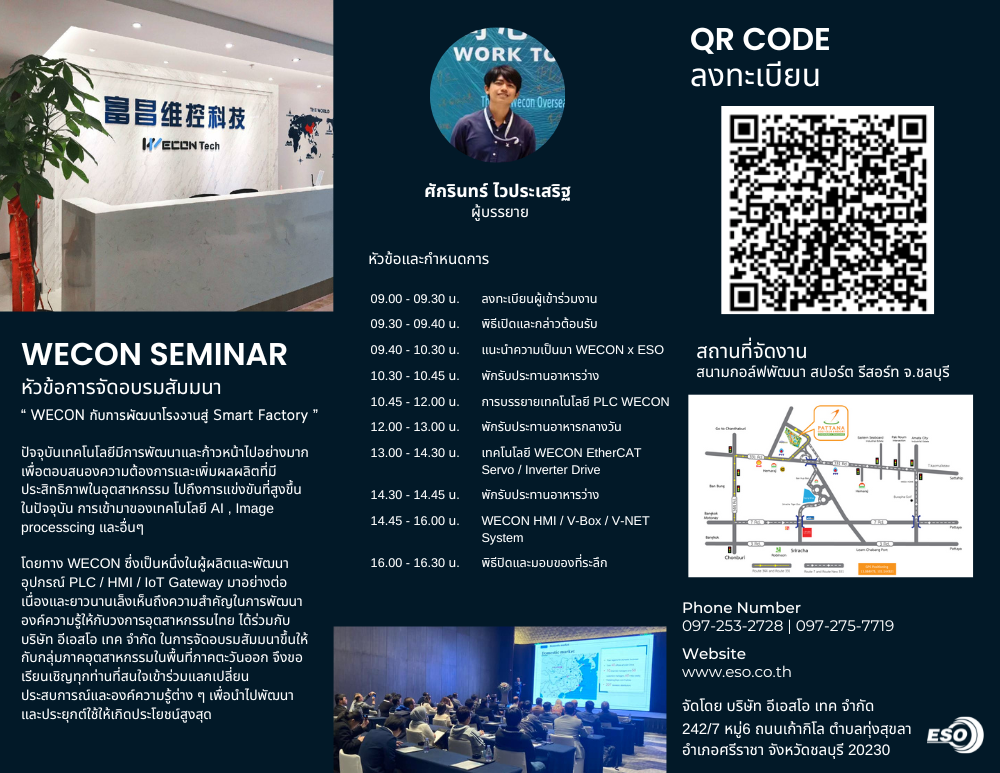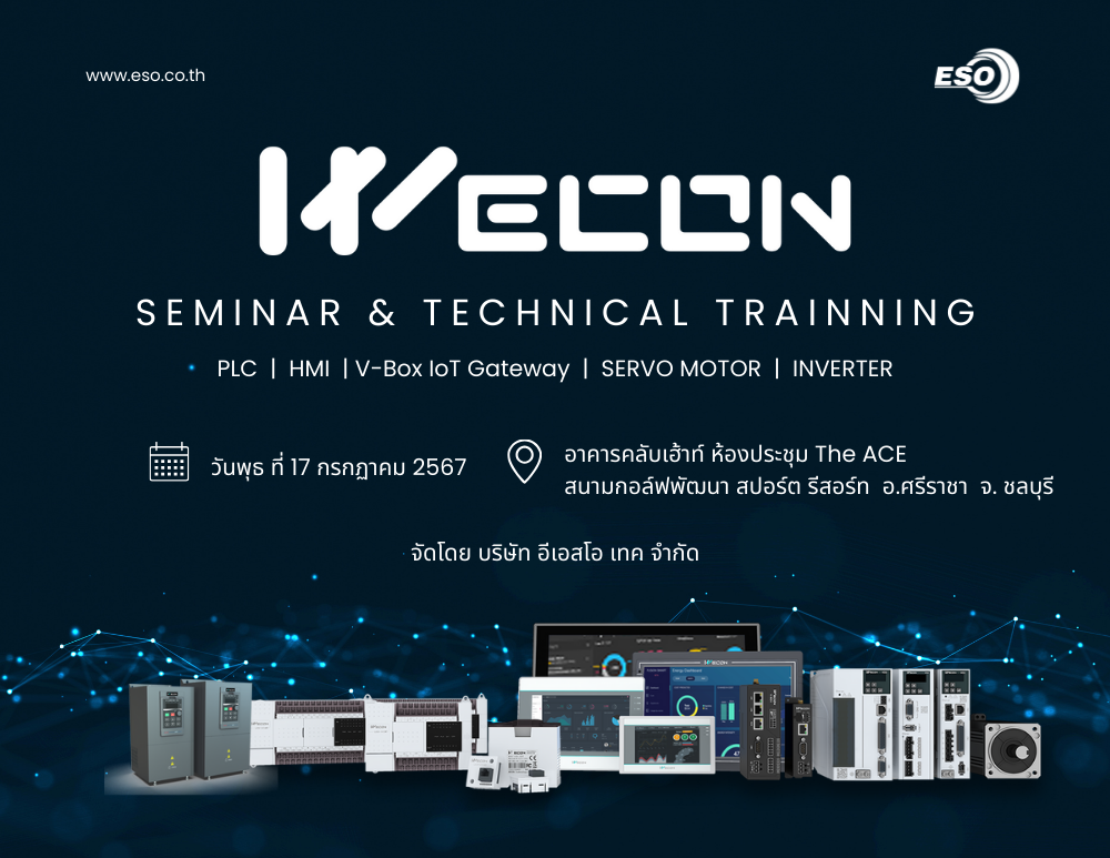 ทาง WECON ซึ่งเป็นหนึ่งในผู้ผลิตและพัฒนาอุปกรณ์ PLC / HMI / IoT Gateway มาอย่างต่อเนื่องและยาวนานเล็งเห็นถึงความสำคัญในการพัฒนาองค์ความรู้ให้กับวงการอุตสาหกรรมไทย ได้ร่วมกับ บริษัท อีเอสโอ เทค จำกัด ในการจัดอบรมสัมมนาขึ้นให้กับกลุ่มโรงงานภาคอุตสาหกรรมในพื้นที่ภาคตะวันออก จึงขอเรียนเชิญทุกท่านที่สนใจเข้าร่วมแลกเปลี่ยนประสบการณ์และองค์ความรู้ต่าง ๆ เพื่อนำไปพัฒนาและประยุกต์ใช้ให้เกิดประโยชน์สูงสุด