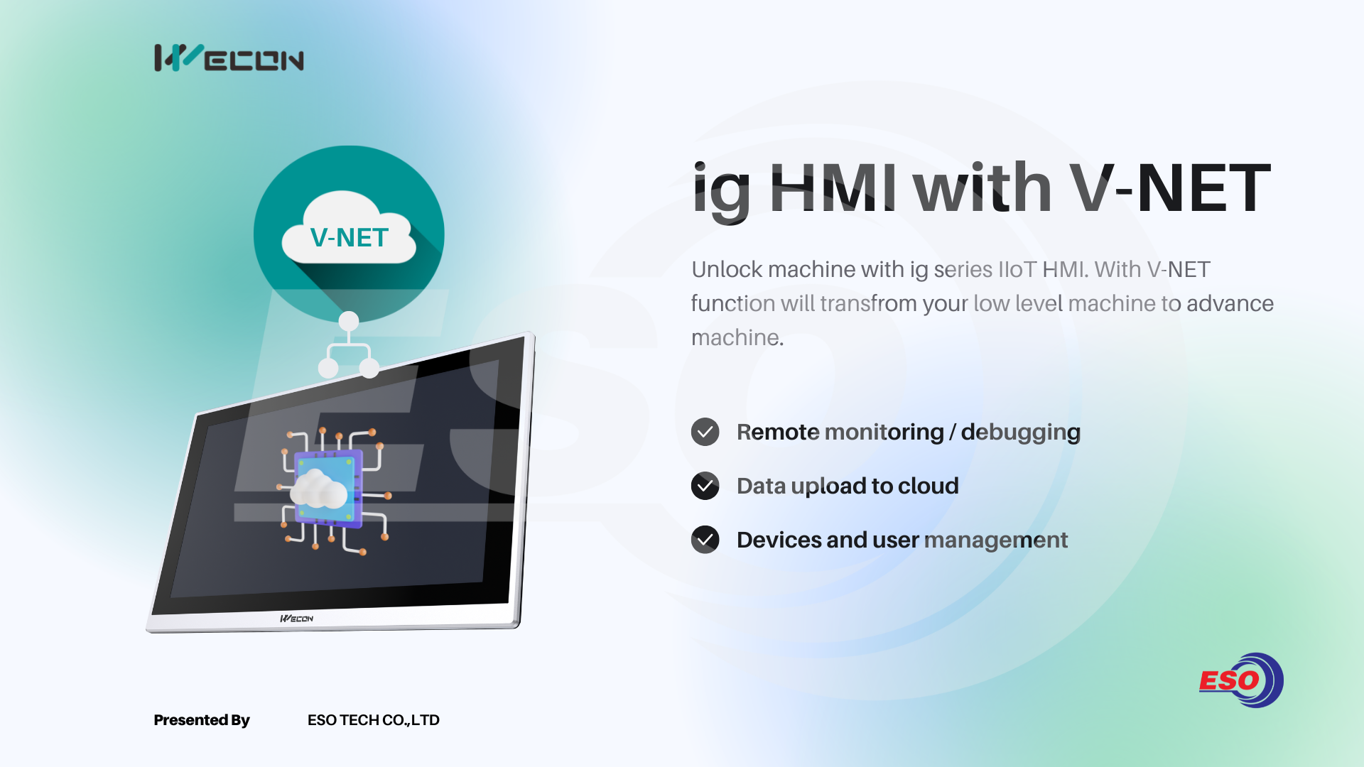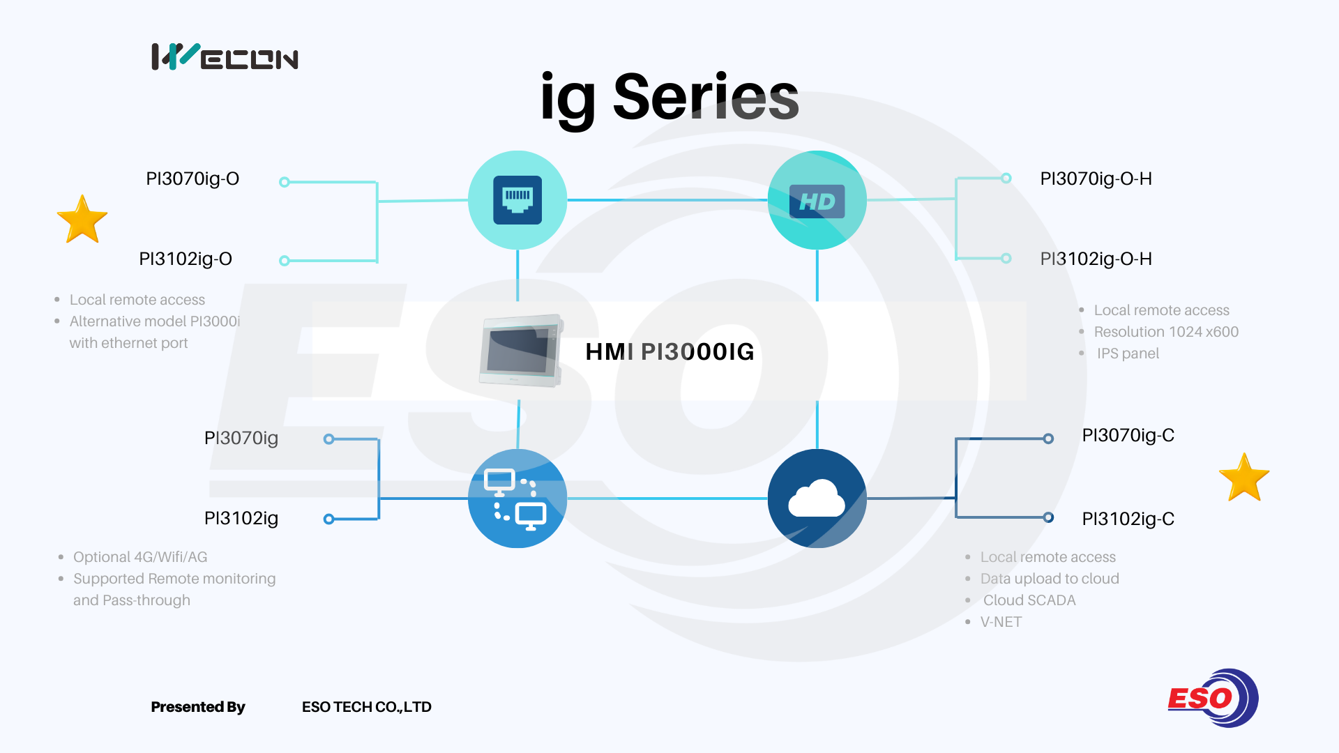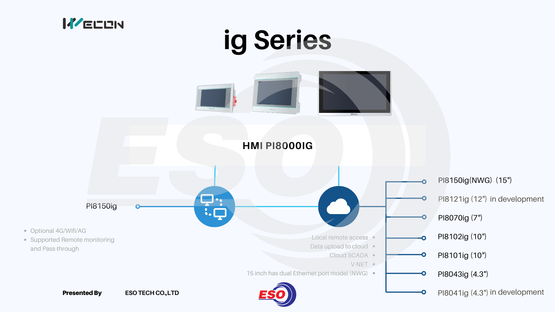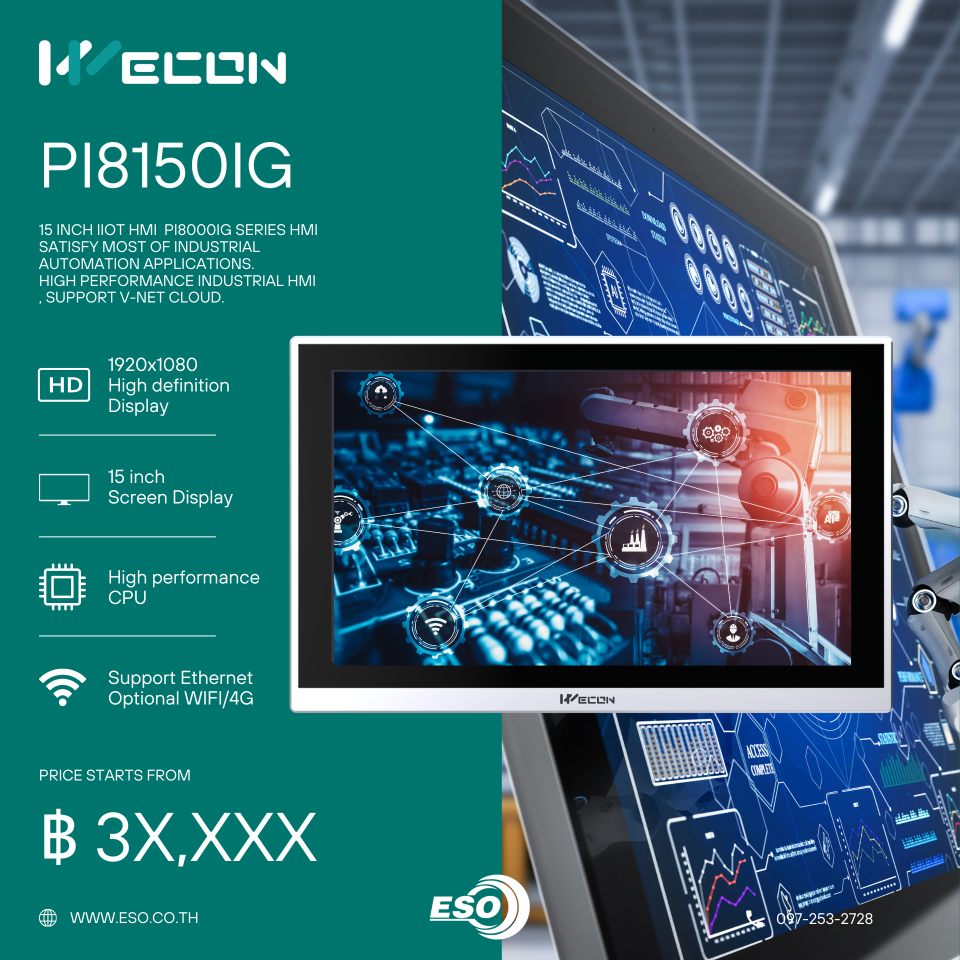 PI8000ig Series (IIoT HMI) ท็อบซีรี่ย์สุด ณ ปัจจุบันโดยทาง WECON ได้พัฒนาซีรี่ย์นี้มาเป็นซีรี่ย์ Flagship ของทาง WECON เพื่อทำมาทดแทน PI8000/PI9000 Series เดิม ซึ่งรุ่นนี้ฟีเจอร์ของ IoT HMI จะเหมือนกันกับ PI3000ig Series แต่ว่า Tag ที่จะ Config ขึ้นระบบ V-NET จะสูงกว่ามาก ยกตัวอย่างเช่น PI3000ig Series Realtime tag V-NET = 100 tags แต่ PI8000ig Series = 300 tags