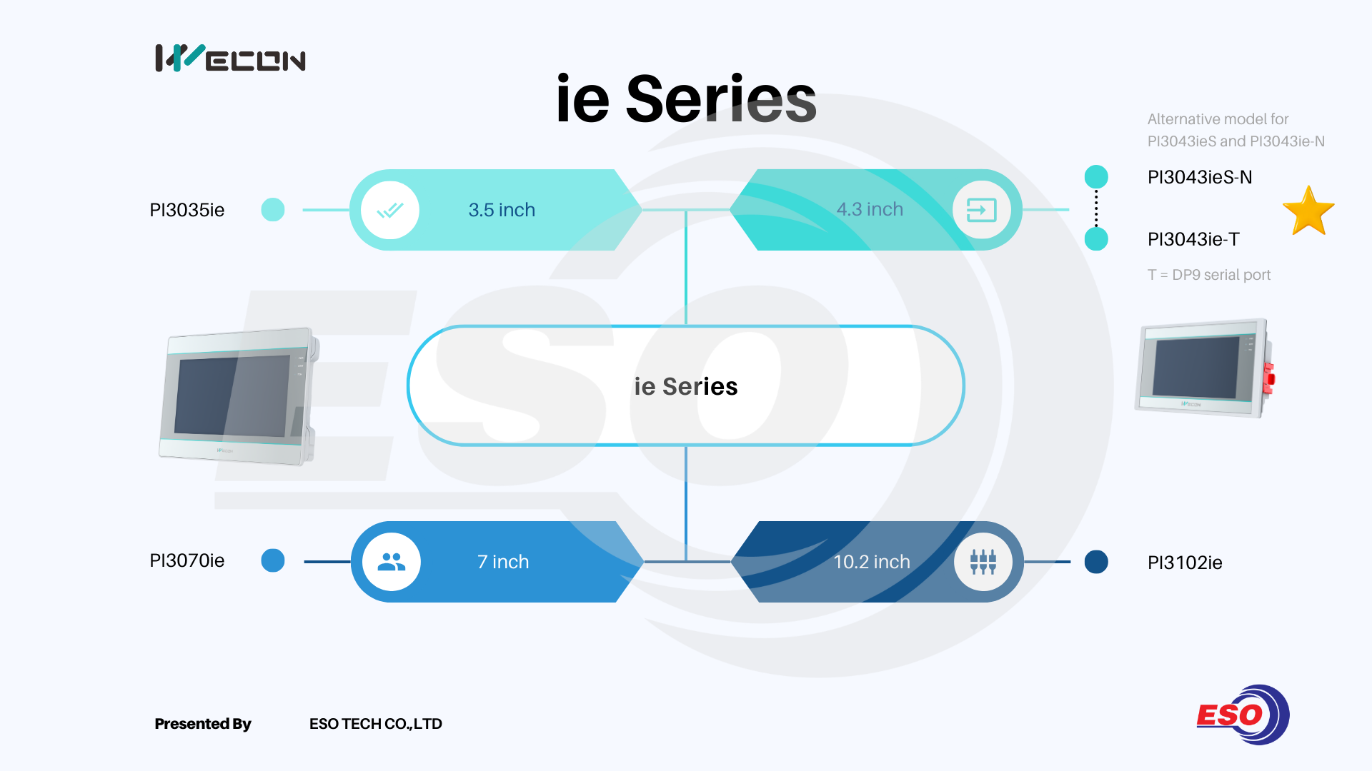 PI3000ie Series จริงๆ แล้วรุ่นนี้ทางด้านดีไซน์ไม่ได้แตกต่างกันมากนักกับ PI3000i Series แต่ซีรี่ย์นี้มีการพัฒนาฟีเจอร์เพิ่มเติมมาอีกมาก และมีการปรับปรุงฮาร์ดแวร์และเฟริมแวร์ที่มีความเร็วและการตอบสนองที่ดีกว่ารุ่น PI3000i Series มี Interface communication serial port พื้นฐานที่มากกว่า และที่สำคัญคือสามารถใช้งาน Lua Script ได้ซึ่งทำให้การออกแบบโปรแกรมฟีเจอร์และทำเงื่อนไขบางอย่างของหน้าจอมีประสิทธิภาพมากขึ้น สามารถจัดการที่จอ HMI โดยไม่ต้องพึ่ง PLC ได้เลย