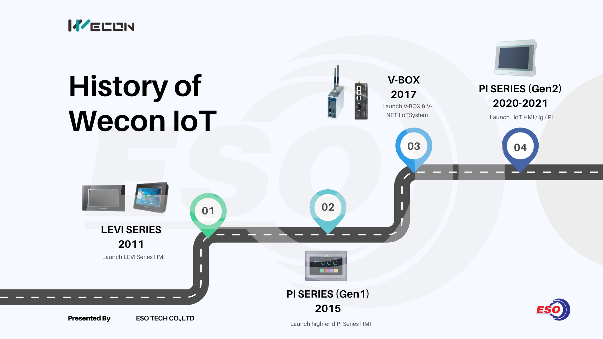 จากภาพเราจะเห็นได้ว่า WECON TECHNOLOGY ก่อตั้งขึ้นเมื่อปี ค.ศ. 2009 และผลิตภัณฑ์แรกที่ WECON พัฒนาคือ HMI นั่นเอง!! โดยเริ่มพัฒนาขึ้นตั้งแต่ก่อตั้งและเปิดตัวครั้งแรกเมื่อปี ค.ศ. 2011 โดย HMI Series แรกสุดเลยคือ LEVI Series และหลังจากนั้นก็ได้เปิดตัว PLC LX Series เป็นลำดับถัดไปในปี ค.ศ. 2012 หากเราจะโฟกัสเฉพาะ HMI ในปี ค.ศ. 2015 WECON ได้เปิดตัว HMI Series ใหม่ขึ้นมาอีกหนึ่งซีรี่ย์คือ PI Series ซึ่งผมจะเรียก HMI PI Series ที่เปิดตัวในปี 2015 ว่าเป็น PI Series Gen1 ยุคต้นก็แล้วกันเพื่อให้แยกแยะได้ง่าย และในปี ค.ศ. 2020 ก็ได้มีการเปิดตัว IoT HMI แต่ยังเป็น PI Series ผมจะเรียกว่าเป็น PI Series Gen2 ในยุคปัจจุบัน ซึ่งมีรายละเอียดและฟังก์ชั่นที่แตกต่างเดียวเราจะมาไล่เรียงกัน