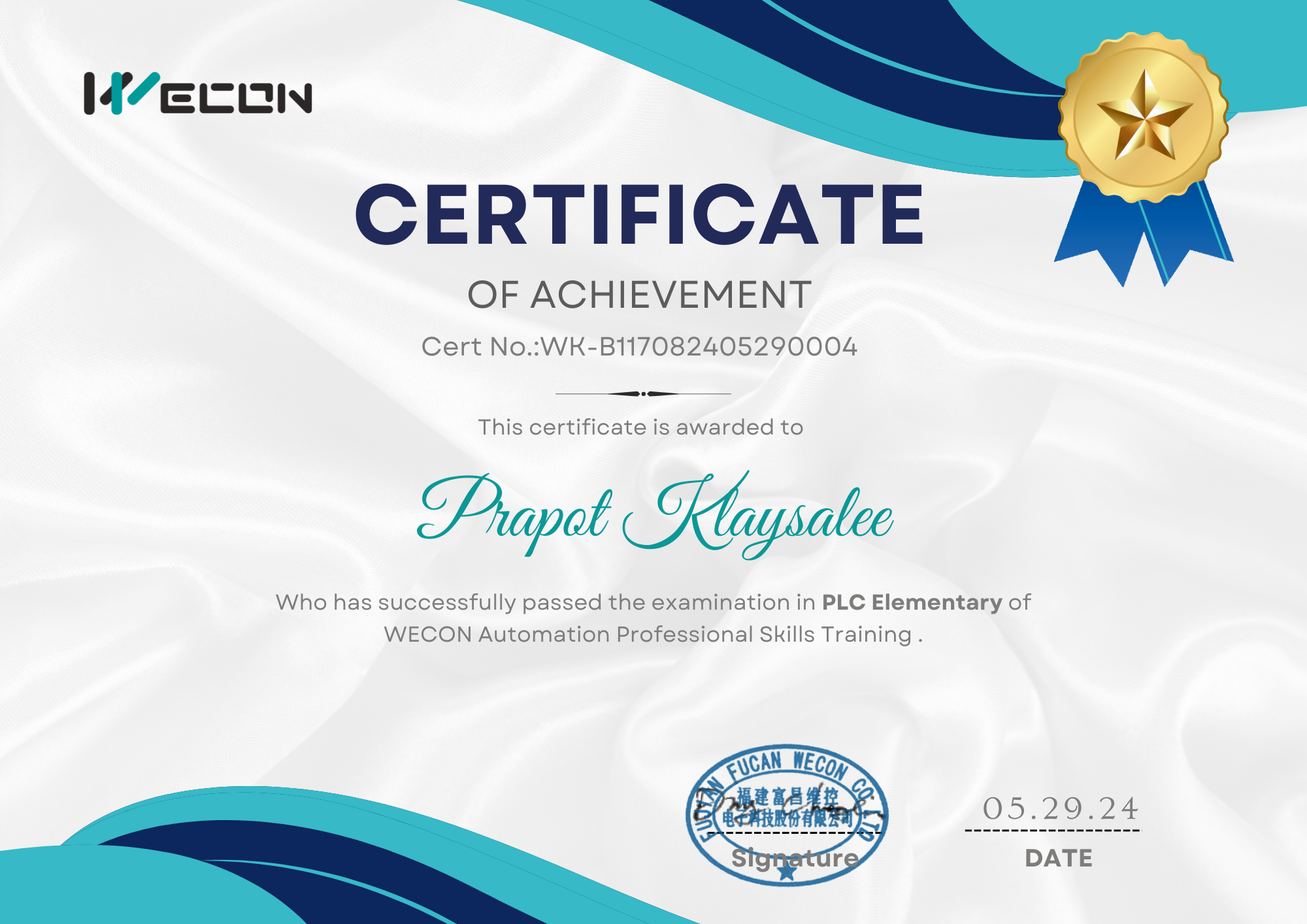ใบประกาศนียบัตรผู้ผ่านการอบรมและทดสอบจากทาง WECON