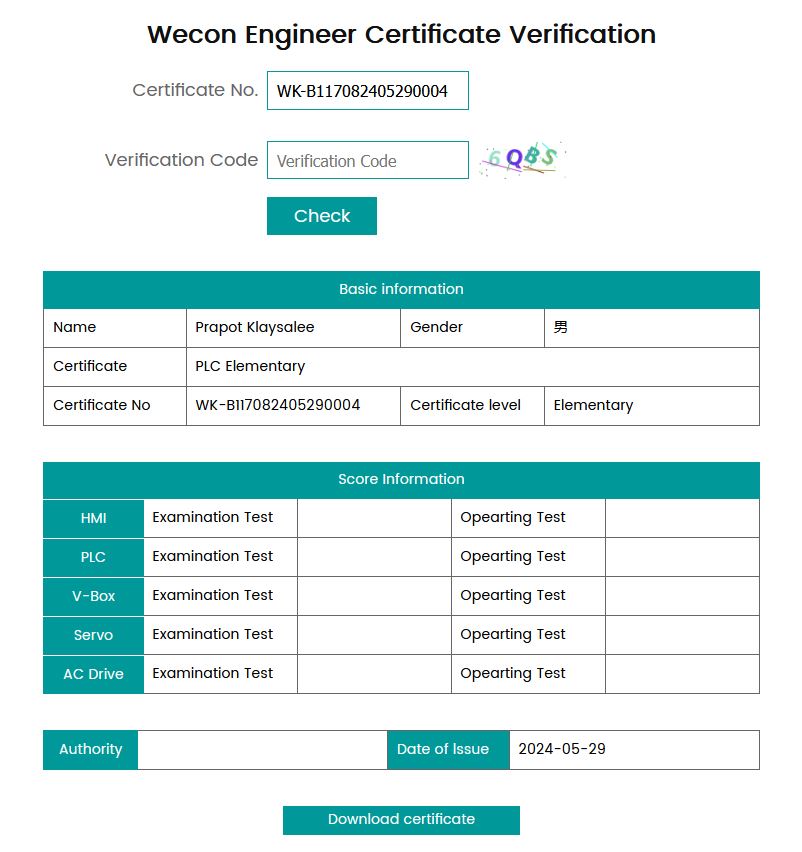 โดยใบประกาศนียบัตรที่ออกจากทาง WECON TECHNOLOGY จะมีหมายเลขกำกับทุกใบซึ่งทุกคนสามารถนำไปสืบค้นในระบบของ WECON ได้ว่าได้รับการอบรมจริง ท่านสามารถสืบค้นและตรวจสอบผู้ให้บริการทางเทคนิคของทาง WECON ได้ที่นี่ https://www.we-con.com.cn/en/certificate.html