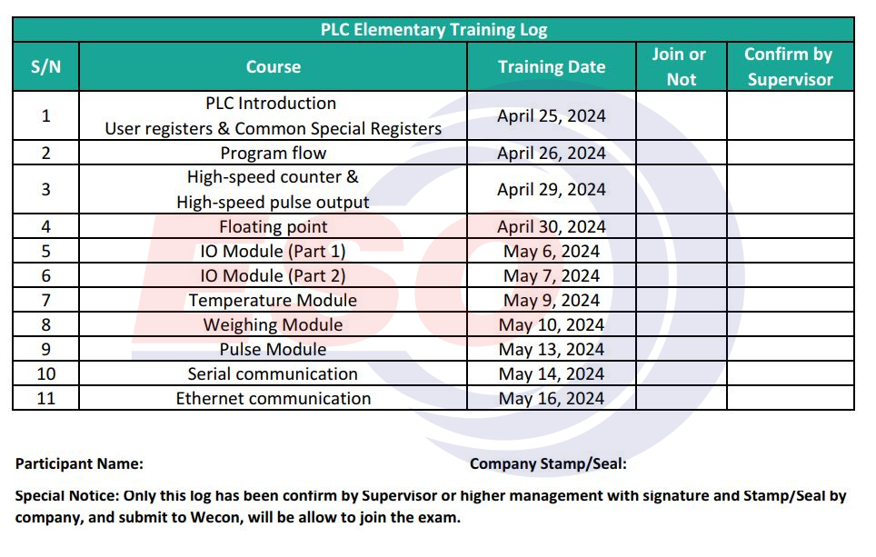 ซึ่งหากลูกค้าท่านใดต้องการที่จะเข้าร่วมการฝึกอบรมและทดสอบจากทาง WECON ท่านสามารถติดต่อ บริษัท อีเอสโอ เทค จำกัด ตัวแทนจำหน่ายผลิตภัณฑ์ WECON ประจำประเทศไทยได้โดยตรง ซึ่งทางเราจะดำเนินการลงทะเบียนและประสานงานให้ แต่ทั้งนี้ทั้งนั้นทางบริษัทฯ จะมีเกณฑ์ขั้นต้นในการคัดกรองผู้ที่จะเข้าร่วมการฝึกอบรม ซึ่งจะขอสงวนสิทธิ์และเงื่อนไขให้เป็นไปตามที่บริษัทฯ กำหนด