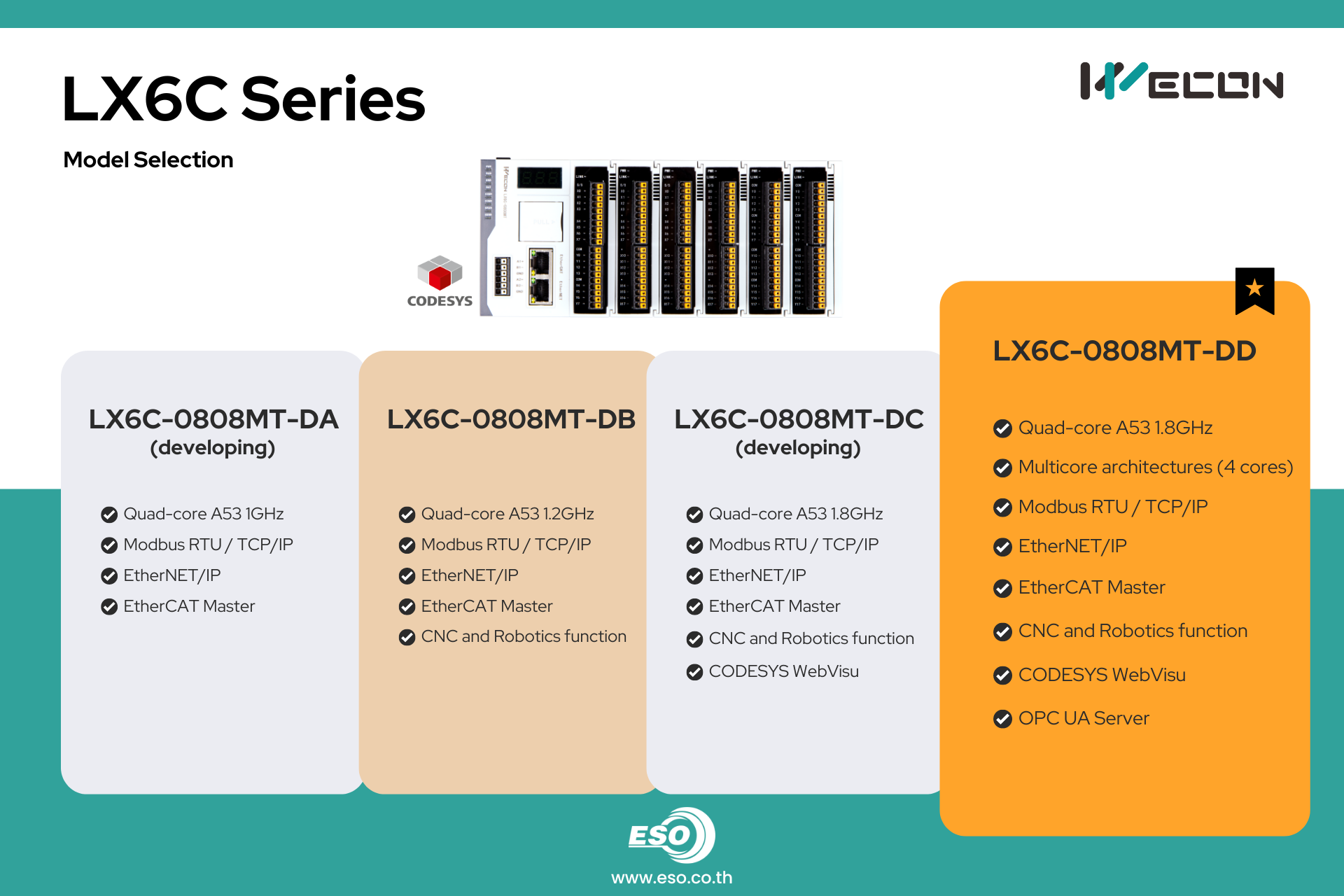 5. LX6C-0808MT-DD รุ่นนี้ถือเป็นรุ่นท็อบสุด ณ วันนี้ เปิดตัวและวางจำหน่ายแล้วจัดเต็มทุกฟังก์ชั่นแล้วก็แพงที่สุดด้วย รองรับการสื่อสารครบทุกแบบ รองรับการใช้งาน Motion control 64 Axis รุ่นนี้รองรับการใช้งาน OPC UA Server ละจ้า เปลี่ยนการออกแบบหน่วยประมวลผลเป็นแบบ Multi-core architectures 4 core และรองรับ CODESYS Webvisu
