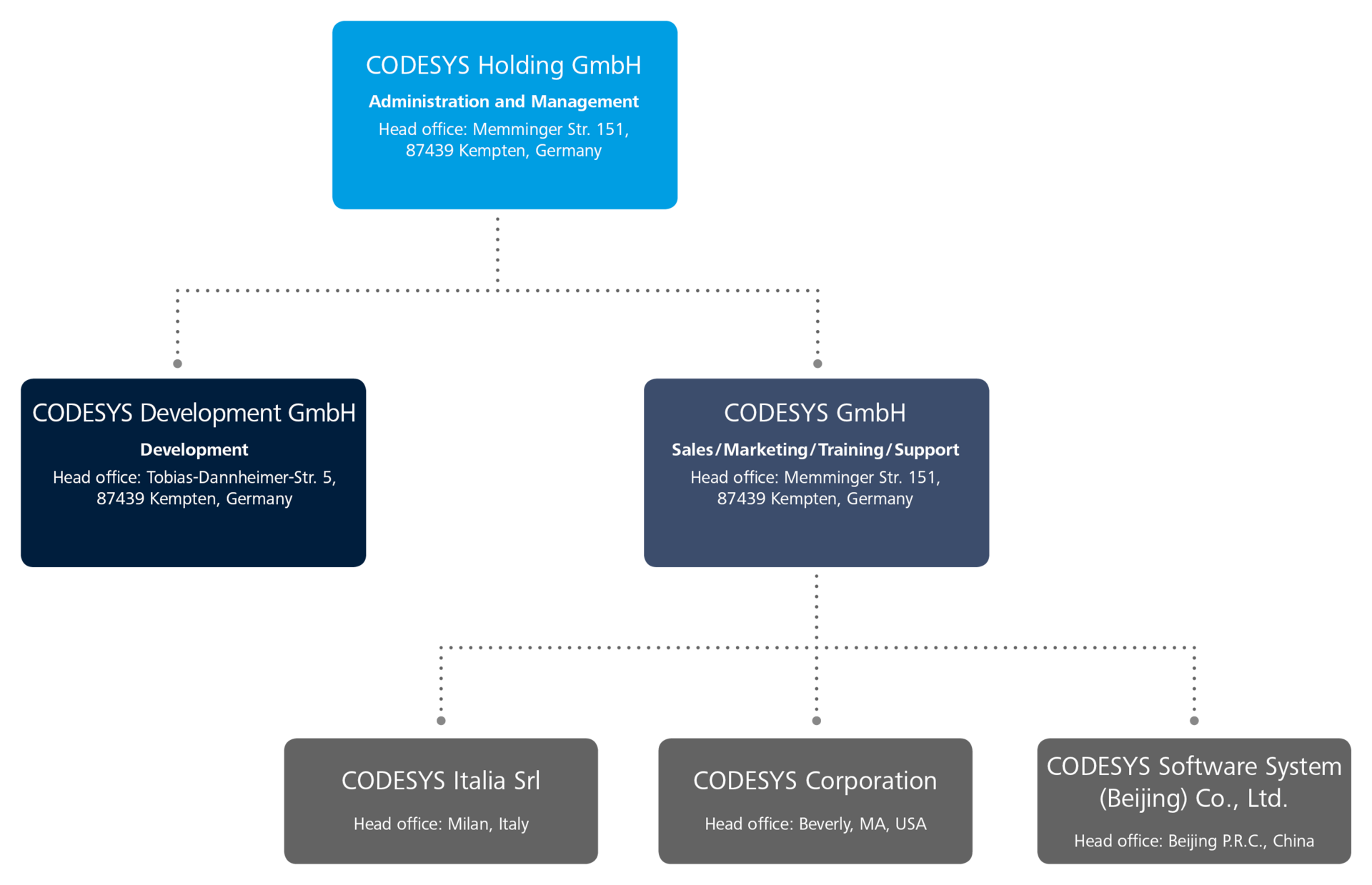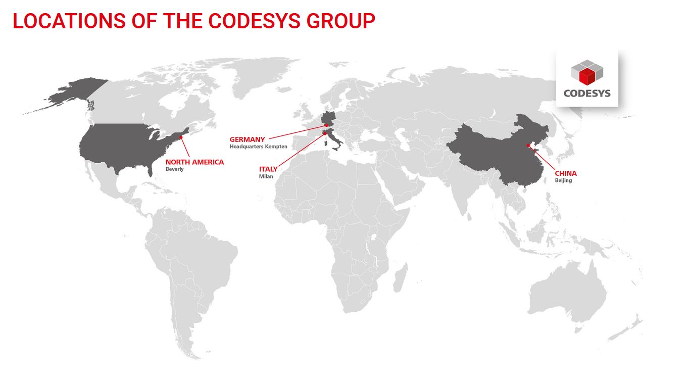 CODESYS GmbH มีสำนักงานใหญ่ตั้งอยู่ที่เมืองเคมพ์เทิน รัฐบาวาเรีย ทางตอนใต้ของประเทศเยอรมนี และปัจจุบันมีสำนักงานสาขา(Subsidiary) ตั้งอยู่อีก 3 ประเทศคือ จีน , อิตาลี และ สหรัฐอเมริกา และยังมี Distributors อีกหลายแห่งทั่วโลก