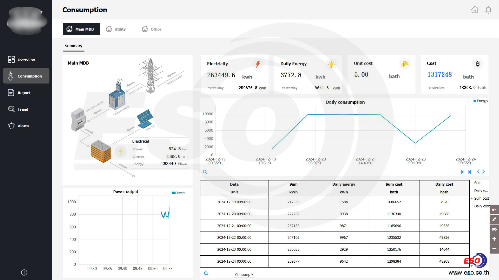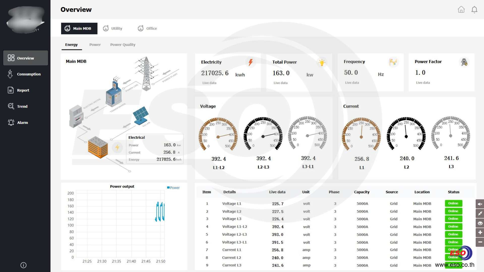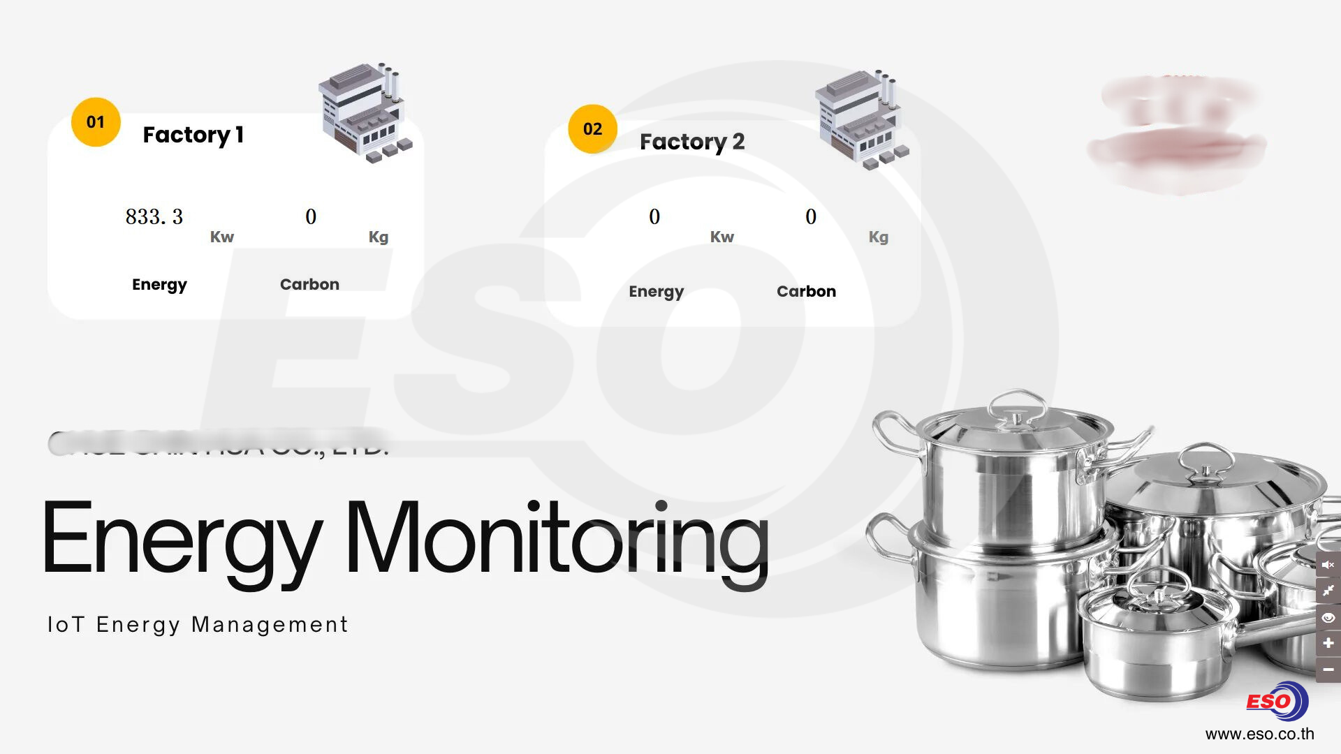 ทางบริษัท อีเอสโอ เทค จำกัด ได้มีโอกาสในการออกแบบและพัฒนาระบบมอนิเตอริ่งค่าพลังงานไฟฟ้าและระบบบันทึกข้อมูลเบื้องต้น ให้กับลูกค้าโรงงานผลิตเครื่องครัวแห่งหนึ่ง ในจังหวัดสมุทรปราการ โดยทางลูกค้าต้องการวัดและมอนิเตอร์ค่าพลังงานไฟฟ้าต่างๆ ที่ตู้ Main MDB ของโรงงานซึ่งไม่มีอุปกรณ์มิเตอร์วัดพลังงานหรืออุปกรณ์ดูและบันทึกข้อมูลมาก่อน เพื่อดูพฤติกรรมการใช้พลังงานไฟฟ้ารวมไปถึงนำไปเปรียบเทียบค่าที่วัดได้จากมิเตอร์ของทางการไฟฟ้า ซึ่งทางทีมงานจึงได้เลือกอุปกรณ์และระบบที่ไม่ซับซ้อนมากนักและไม่ต้องเพิ่ม/เปลี่ยนอุปกรณ์อะไรมากมาย เพื่อให้ง่ายต่อการใช้งานและการดูแล
