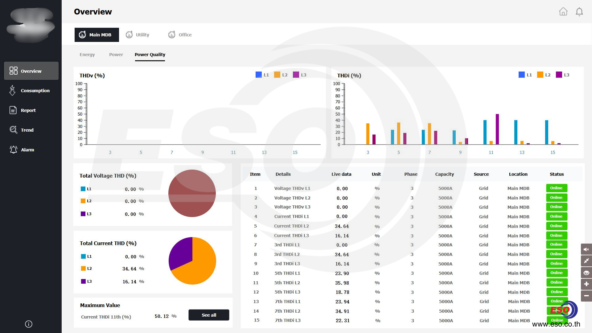 อีกส่วนที่ไม่อยากให้มองข้ามคือคุณภาพของระบบไฟฟ้าซึ่งอย่างที่กล่าวไปข้างต้น ER-P300 นั้นสามารถที่จะดูค่าฮาร์โมนิกส์ทั้งของแรงดันและกระแสไฟฟ้าได้ตั้งแต่ลำดับ 3/5/7/9/11/13/15 ซึ่งทำผู้ใช้งานสามารถมอนิเตอร์ค่าความผิดปกติของคุณภาพไฟฟ้าที่จ่ายให้กับระบบได้ ซึ่งฮาร์โมนิกส์ในลำดับต่างๆ ก็จะมีนัยยะสำคัญที่แตกต่างกันไป ซึ่งหากสังเกตจาก Dashbaord เราได้ทำการแยกหน้ามอนิเตอริ่งคุณภาพไฟฟ้ามาโดยเฉพาะ ซึ่งมิเตอร์ไฟฟ้ารุ่น ER-P300 นั้นราคาเพียง 4,xxx บาท เท่านั้น คุ้มค่าสุดๆ !!