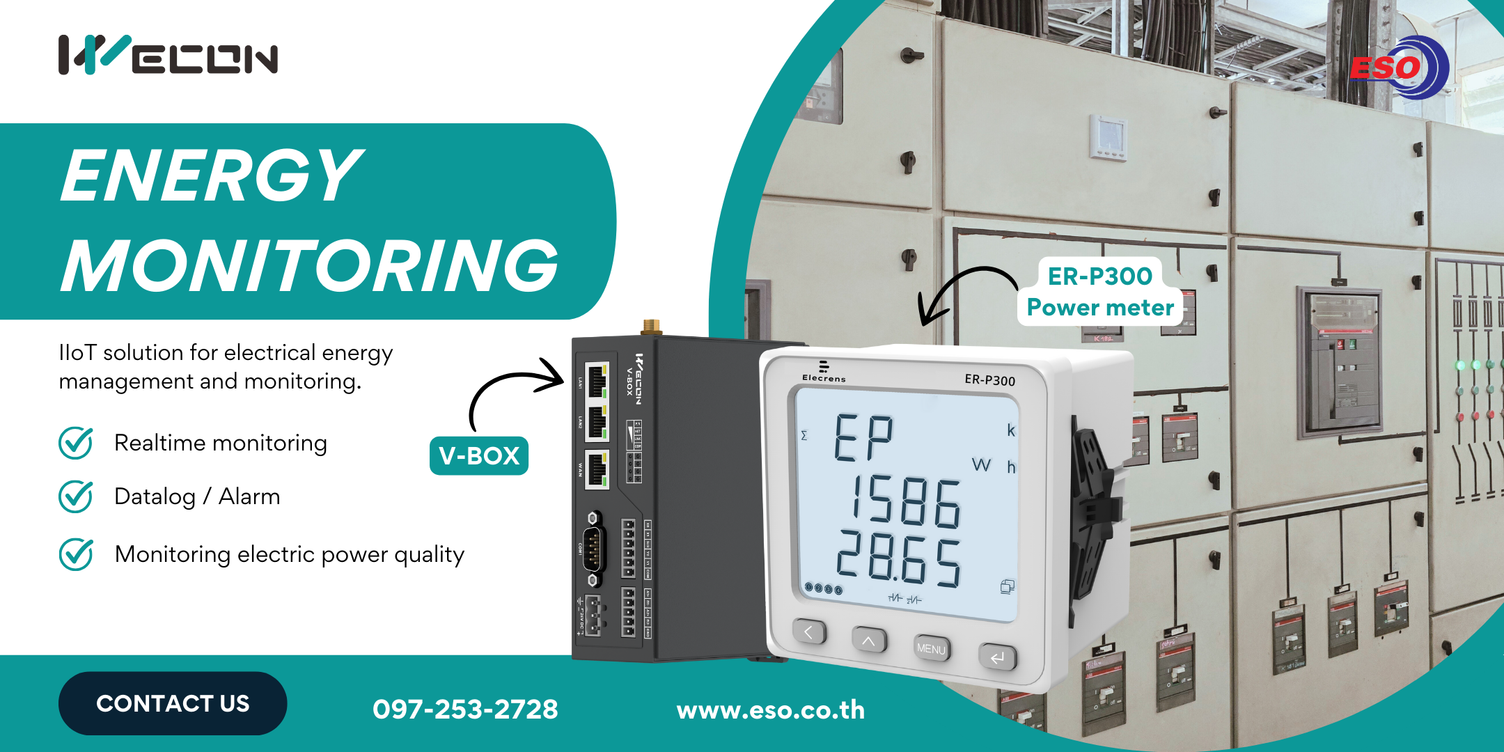 โดย Energy meter ER-P300 นั้นมีฟังก์ชั่นและฟีเจอร์ต่างๆ มากมาย ซึ่งให้ค่าความแม่นยำสำหรับการวัดค่าการใช้พลังงานไฟฟ้า (active energy) ที่คลาส 0.5S ขนาดหน้าปัดมาตรฐาน 96x96 mm ซึ่งสามารถถอดเปลี่ยนกับมิเตอร์เข็มเดิมที่ติดตั้งตามตู้ MDB ได้เลย วัดค่าพลังงานพื้นฐานได้ อาทิ V/A/P/Q/S/PF/Frequency และปริมาณการใช้พลังงานสะสม Active energy และรองรับการวัดค่าพลังงานไฟฟ้าที่จ่ายออกจากระบบในกรณีมีระบบโซล่าเซลล์ด้วย (bi-direction energy) และยังสามารถวัดค่าคุณภาพไฟฟ้าได้เบื้องต้นด้วย เช่น THD / Harmonics V/A ลำดับที่ 3,5,7,9,11,13,15 ซึ่งมิเตอร์วัดพลังงาน ER-P300 นั้นรองรับการสื่อสารผ่านพอร์ต RS485 Modbus Protocol ซึ่ง V-Box IoT Gateway จะเชื่อมต่อข้อมูลกับมิเตอร์วัดพลังงานผ่านช่องทางนี้