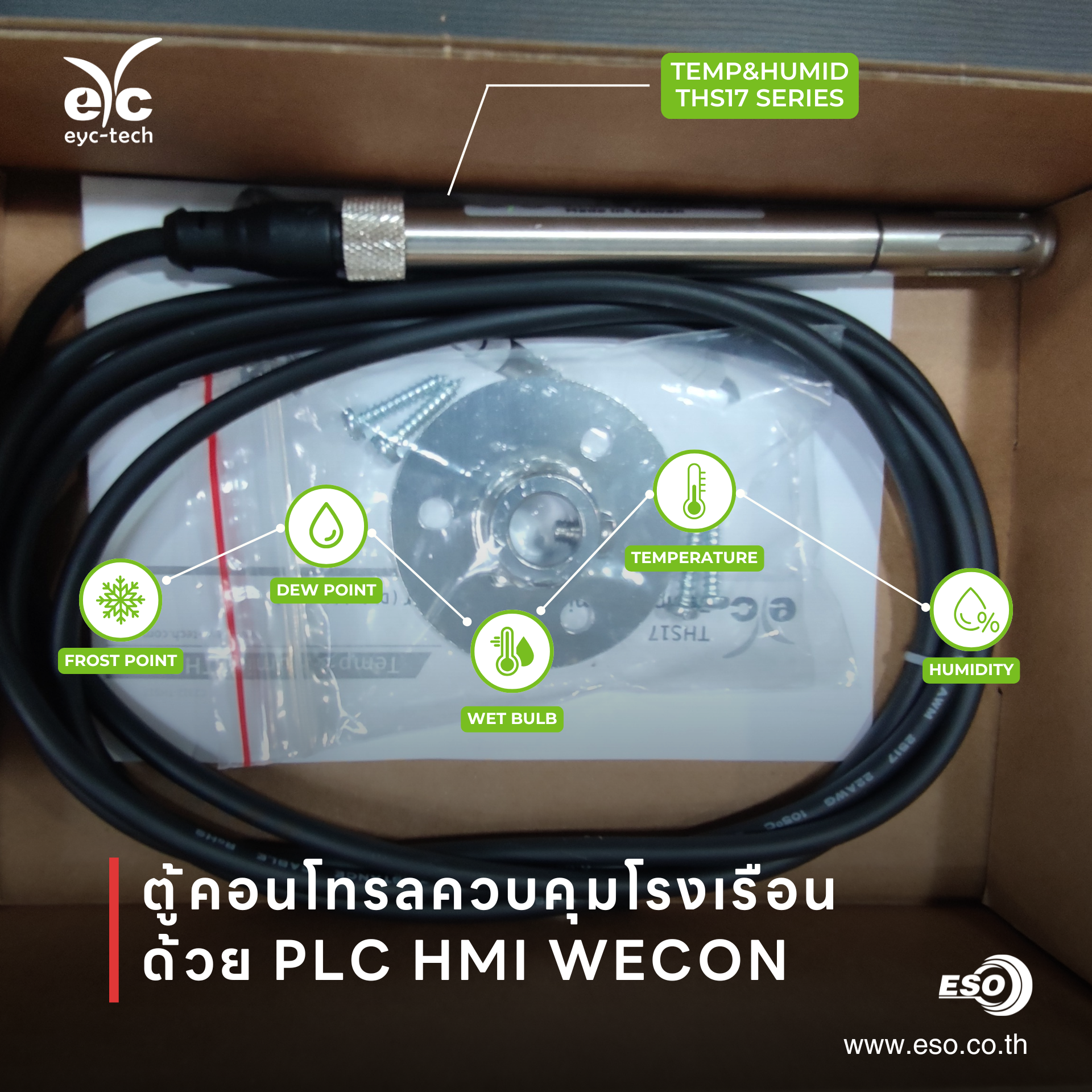 ในโปรเจคนี้ทางทีมงานได้ออกแบบตู้ควบคุม วงจรไฟฟ้าควบคุมด้วย PLC HMI รวมไปถึงจัดหาเซนเซอร์วัดอุณหภูมิความชื้นภายในโรงเรือน ซึ่งใช้เซนเซอร์รุ่น THS17 จากแบรนด์ eyc-tech เซนเซอร์วัดอุณหภูมิความชื้นโพรบโลหะทำจากสแตนเลสมัลติฟังก์ชั่นที่มีความแม่นยำในการตรวจวัดสูงและทนทานต่อสภาพแวดล้อมการใช้งานจริง ออกแบบมาสำหรับงานควบคุมสมาร์ฟาร์ม , โรงเรือนรูปแบบต่างๆ
