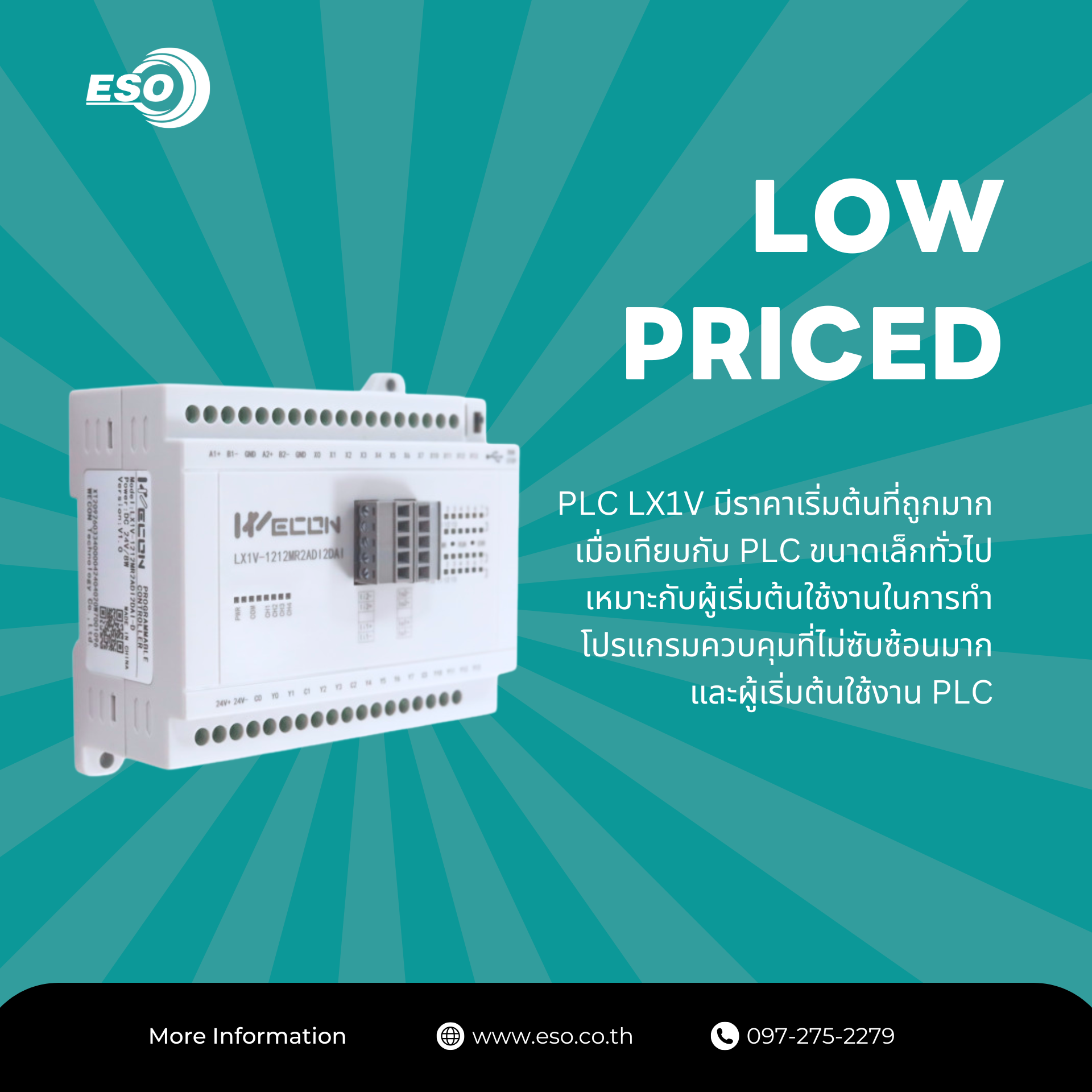2. LOW PRICED PLC LX1V มีราคาเริ่มต้นที่ถูกมากเมื่อเทียบกับ PLC ขนาดเล็กทั่วไป เหมาะกับผู้เริ่มต้นใช้งาน นักศึกษา รวมไปถึงการออกแบบโปรแกรมควบคุมอัตโนมัติที่ไม่ซับซ้อนมากนัก ในงบประมาณที่จำกัด ทำให้การลงทุนใช้งานระบบอัตโนมัติหรือนำไปใช้งานในช่วงเริ่มต้นสามารถลดต้นทุนได้มากขึ้น