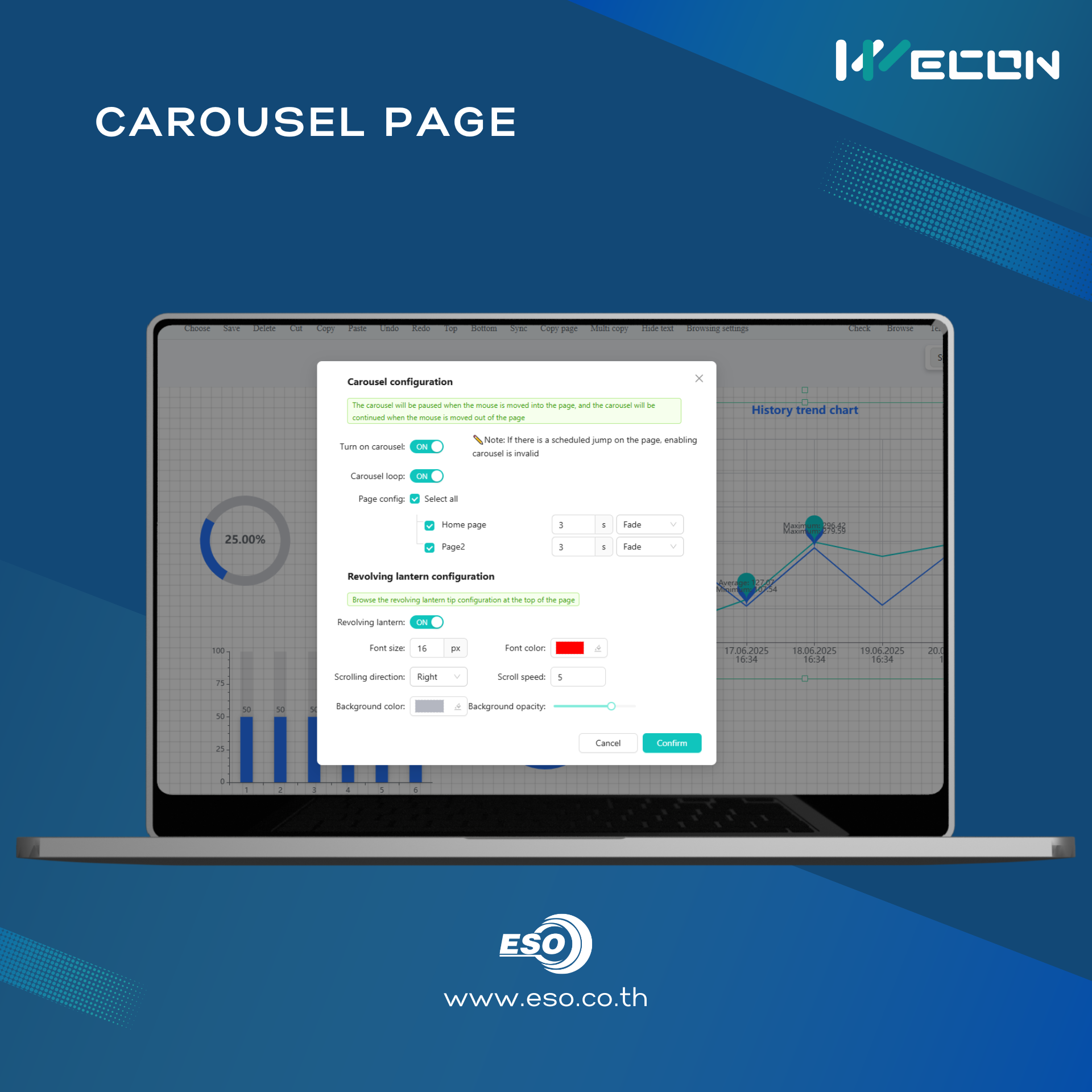 CAROUSEL PAGE ฟังก์ชั่นในการแสดงผลหน้า Dashboard แบบ Loop วนไปเรื่อยๆ ซึ่งจริงๆของเดิมมันก็มีแหละ แต่มันจะต้องเข้าไปตั้งค่าในแต่ละหน้า แต่ใน V-NET 2.0 จะตั้งกำหนดได้ง่ายขึ้นโดยจะมีส่วนตั้งค่าที่ Browsing settings เพิ่มขึ้นมาให้ซึ่งกำหนดได้ทุกเพจ เหมาะกับผู้ใช้งานที่แสดงผลบนจอแสดงผลขนาดใหญ่