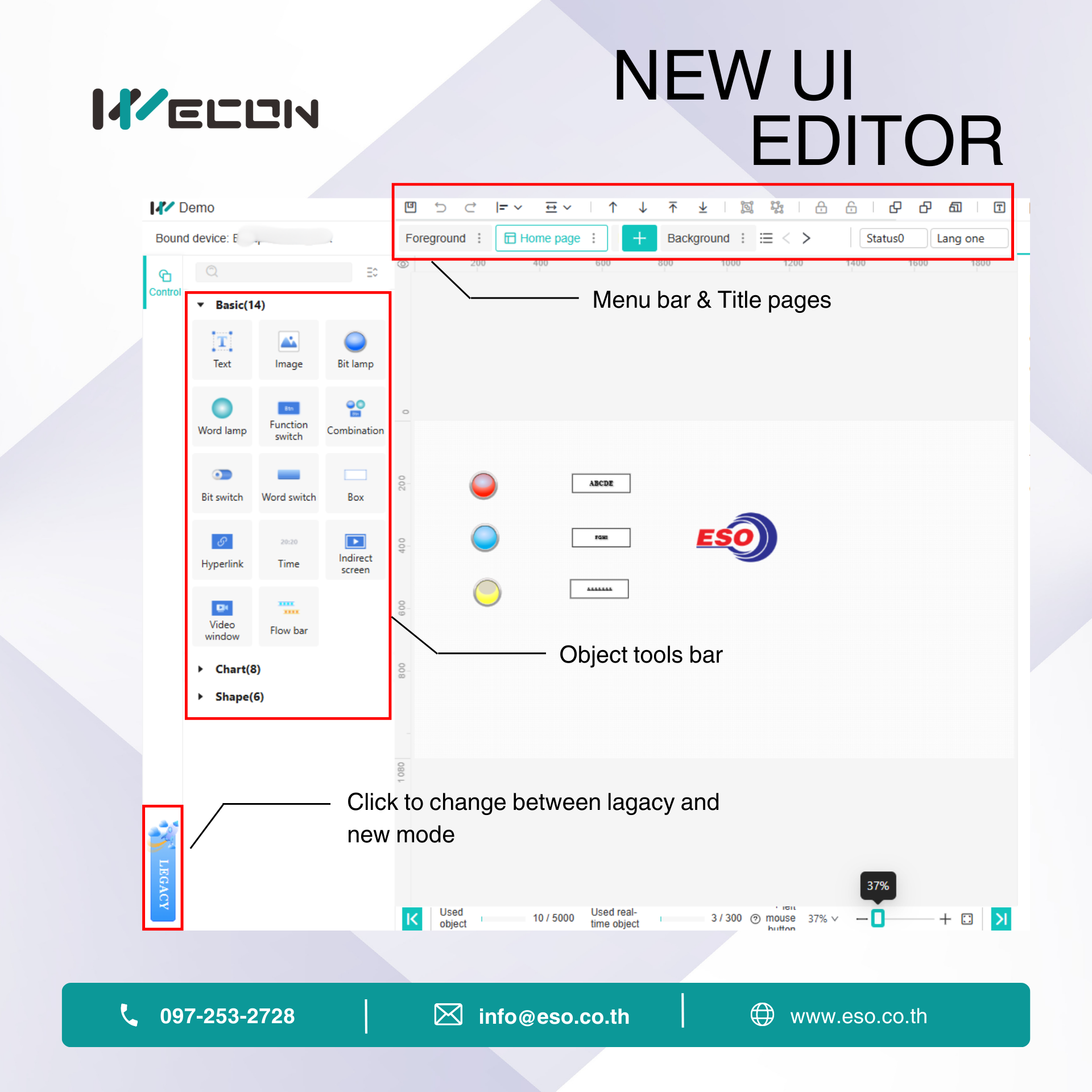 ในการเปลี่ยนแปลง UI Design editor ใหม่นี้ปรับโฉมไปเยอะพอสมควร แน่นอนเลยว่าผู้ใช้งานหลายท่านจะหาปุ่ม Save และ Browse ไม่เจอแน่นอนแอดมินเองก็เช่นกัน ฮ่าๆ โดยทาง WECON ก็ยังไม่ปิดประตูการใช้งานรูปแบบเดิมไปเลย ซึ่งผู้ใช้งานสามารถกดคลิกกลับไปใช้โหมด Legacy (Old design) ได้ถ้าไม่คุ้นชินซึ่งปุ่มจะอยู่ซ้ายล่างของจอและสามารถกดกลับมา New version ได้เช่นกัน