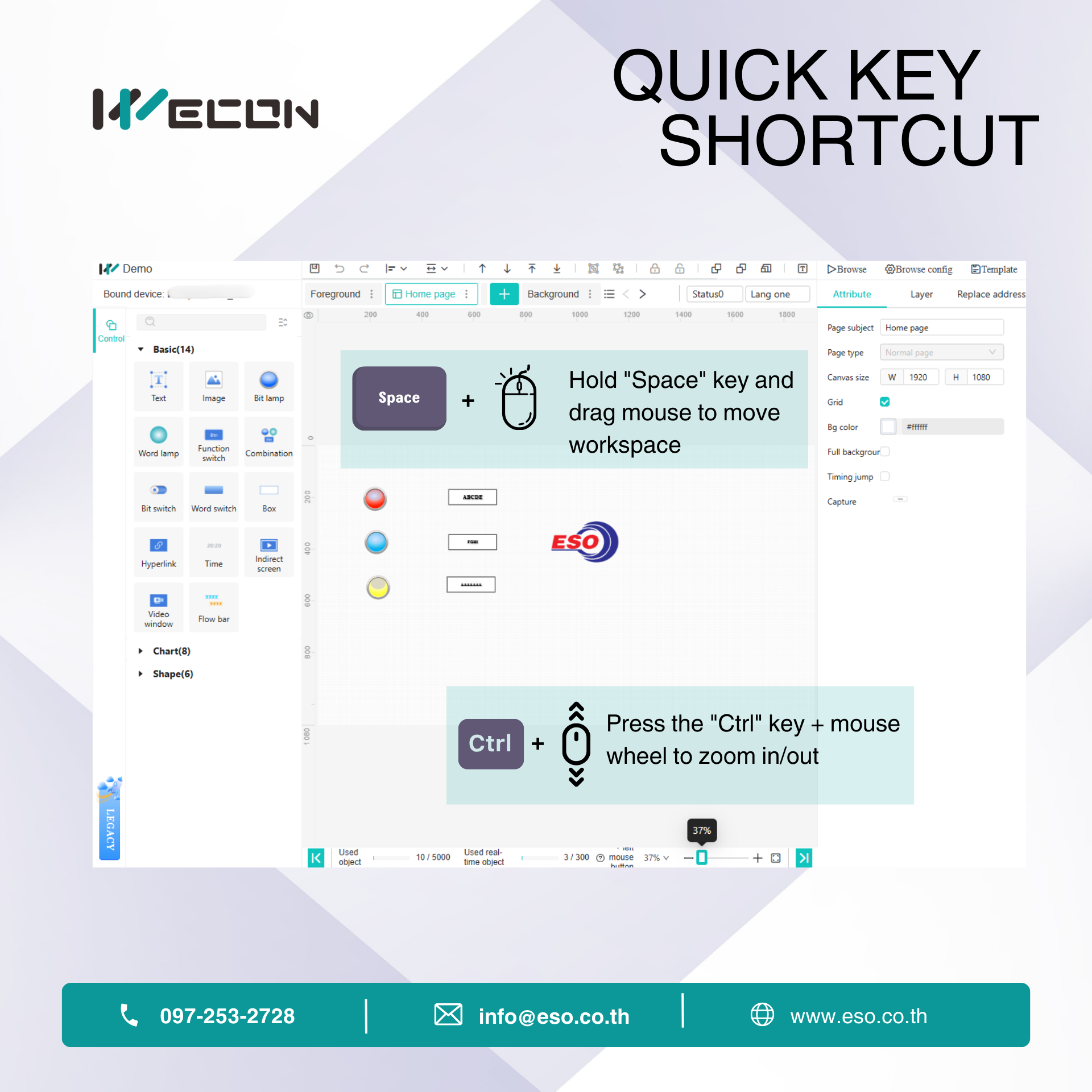 Key Shortcut ตามคอนเซปที่มีการปรับให้ใกล้เคียงซอฟท์แวร์ออกแบบกราฟฟิค มีการเพิ่มคีย์ลัดให้ผู้ใช้งานสะดวกและรวดเร็วมากขึ้น เช่น การซูมเข้าออกสามารถกด Ctrl ค้าง + พร้อมลากลูกเลื่อนสกอร์เมาส์ขึ้นลงได้เลย หรือ กดปุ่ม Space ค้าง + คลิกเมาส์เพื่อลาก Working area ไปมาสะดวกรวดเร็วเวลาย้ายไปแก้ไข Object ต่างๆ