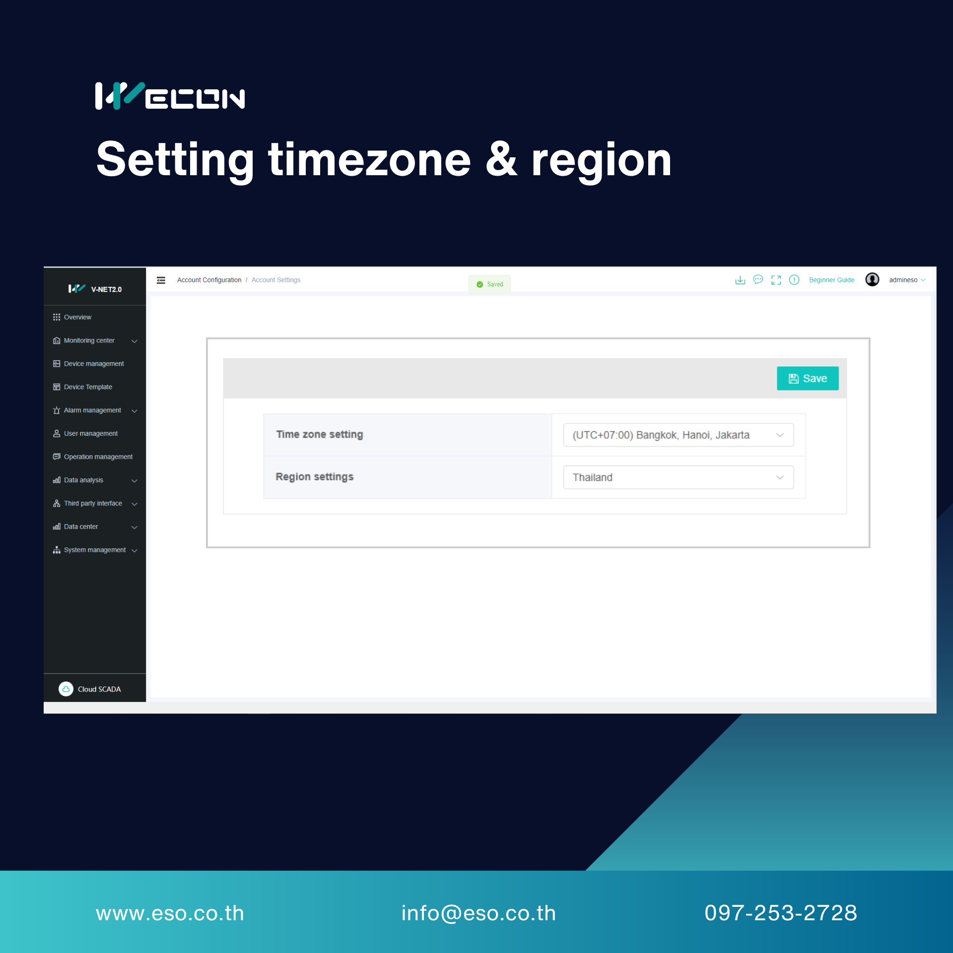 จากนั้นเราจะพบกับหน้าที่ให้ผู้ใช้งานนั้นตั้ง Timezone และ Region ให้ผู้ใช้งานตั้งเวลาและประเทศที่นำอุปกรณ์ไปใช้ เพียงเท่านี้เวลาบน Datarecord , Alarm record รวมไปถึงกราฟข้อมูลย้อนหลังต่างๆ ก็จะตรงกับเวลาจริง