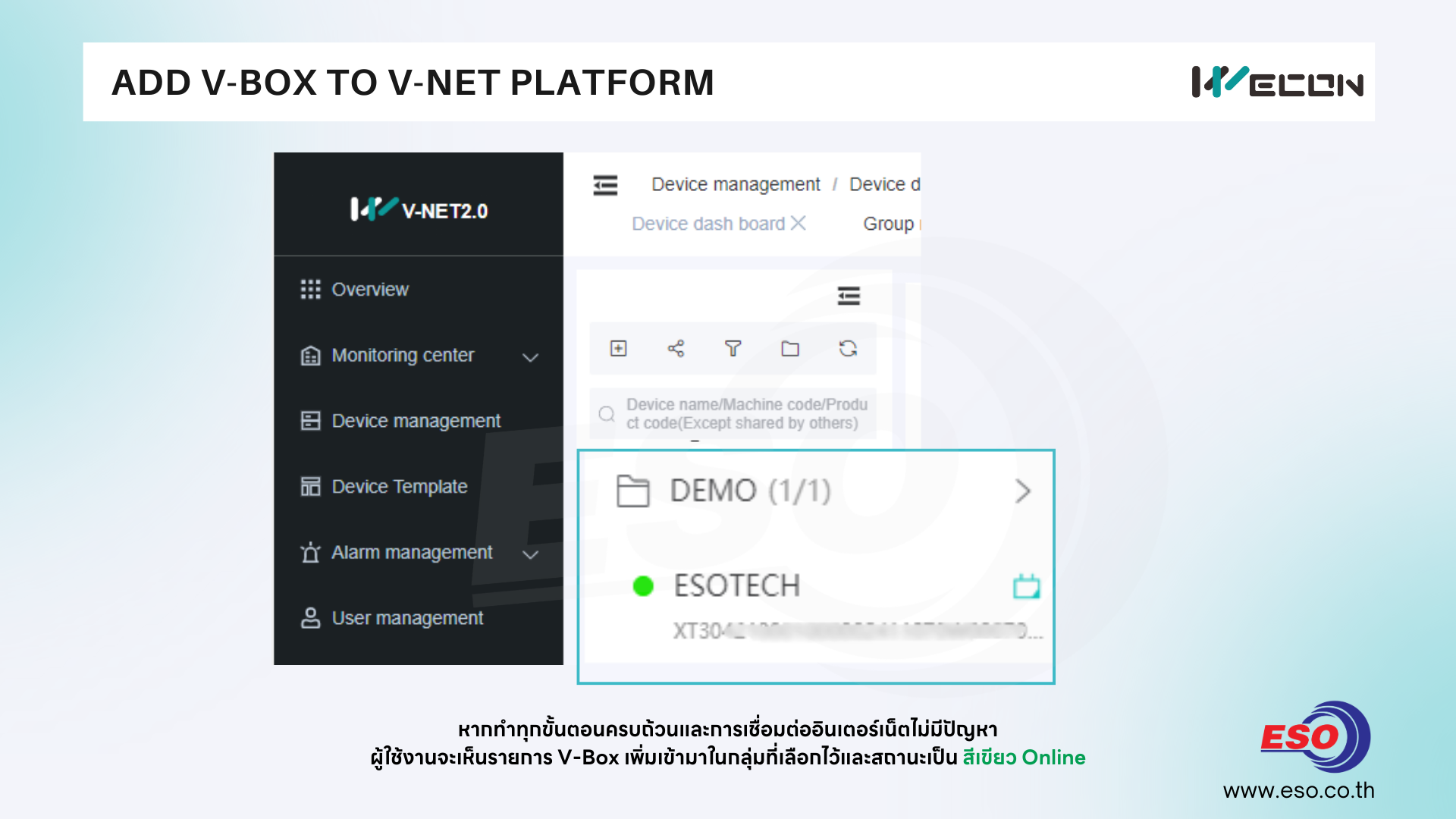 ผู้ใช้งานจะเห็นรายการ V-Box เพิ่มเข้ามาในกลุ่มที่เลือกไว้และสถานะเป็น สีเขียว Online เป็นอันเสร็จเรียบร้อย