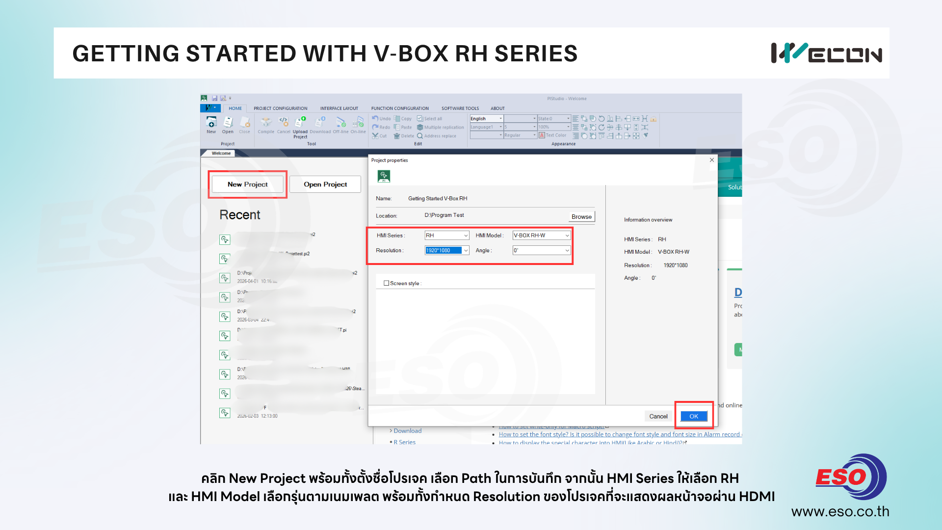 3.กดคลิกไปที่ New Project เพื่อทำการสร้างโปรเจคใหม่ จากนั้นให้ตั้งชื่อไฟล์ เลือก Path ที่บันทึกไฟล์ให้เรียบร้อย และให้เลือก HMI Series = RH และ HMI Model ให้ผู้ใช้งานดูรุ่นที่ Label ข้างอุปกรณ์ ในตัวอย่างนี้ได้ใช้รุ่น V-BOX RH-W