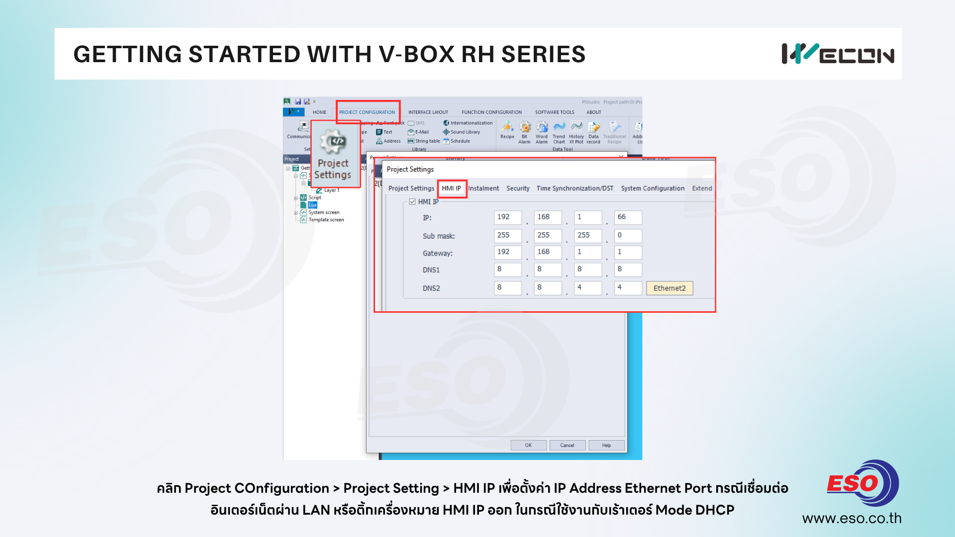 5. จากนั้นให้ผู้ใช้งานกดไปที่แท็บ Project Configuration คลิกที่ปุ่ม Project Setting > HMI IP เพื่อตั้งค่า IP Address ให้กับอุปกรณ์ V-BOX RH SEREIS ในกรณีนี้คือ กำหนดไอพีแอดเดรสให้กับ V-BOX ซึ่งหากต้องเชื่อมต่ออินเตอร์เน็ตผ่านพอร์ต LAN หรือ Ethernet ผู้ใช้งานควรตรวจสอบการตั้งค่ากับเร้าเตอร์ให้ดี