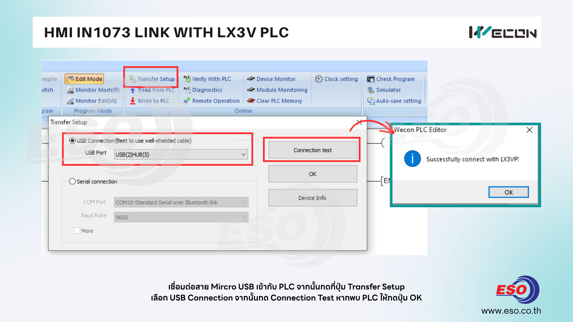 เลือก USB Connection จากนั้นกด Connection Test หากคอมพิวเตอร์สามารถเชื่อมต่อกับ PLC ได้ โปรแกรมจะแสดงหน้าต่าง Successfully connect with LX3V จากนั้นให้กดปุ่ม OK
