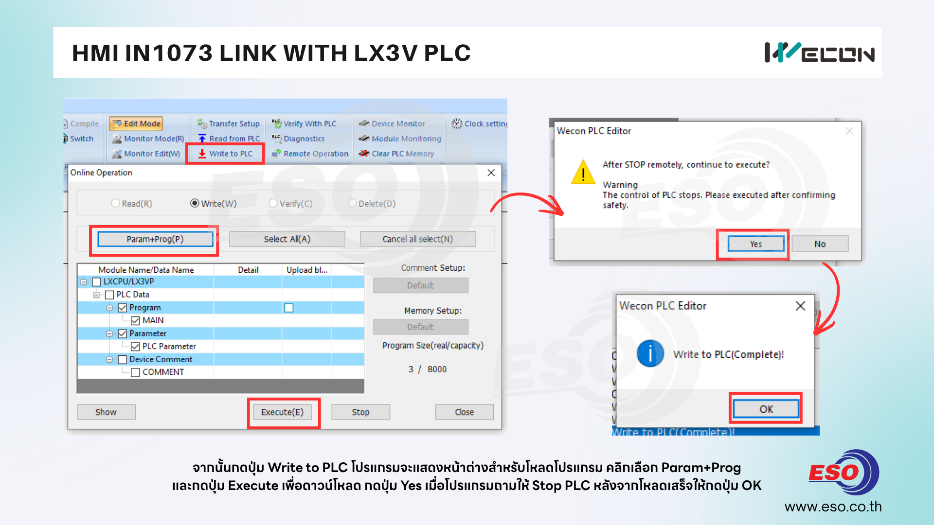 และกดปุ่ม Execute เพื่อเริ่มทำการดาวน์โหลดโปรแกรมไปยัง PLC จากนั้นกดปุ่ม Yes เมื่อโปรแกรมถามให้ Stop PLC ก่อนโหลดโปรแกรม หลังจากโหลดเสร็จซอฟท์แวร์แสดงหน้าต่าง Complete แล้วให้กดปุ่ม OK