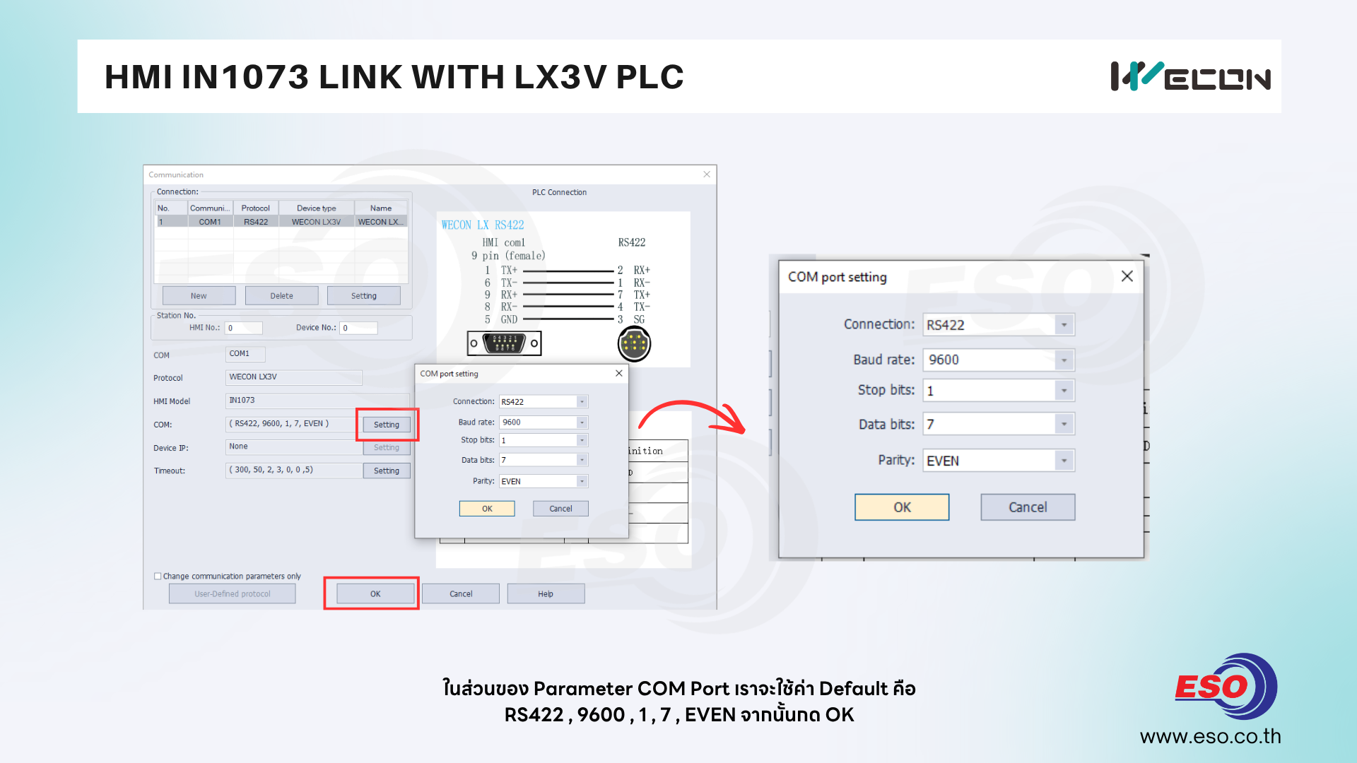 RS422 , Baudrate 9600 , Stop bit 1 , Data bit 7 , Parity EVEN จากนั้นกด OK